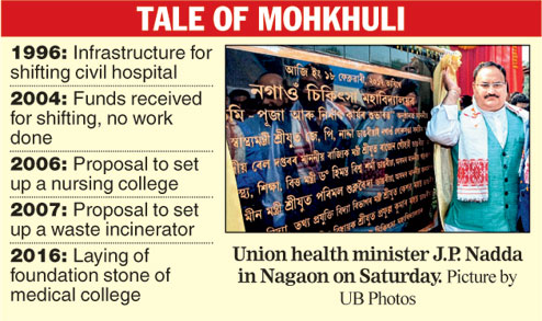 Nagaon, Feb. 18: Union minister for health and family welfare Jagat Prakash Nadda today laid the foundation stone of Nagaon Medical College at Mohkhuli, 5km from here, bringing an end to two decades of speculation.