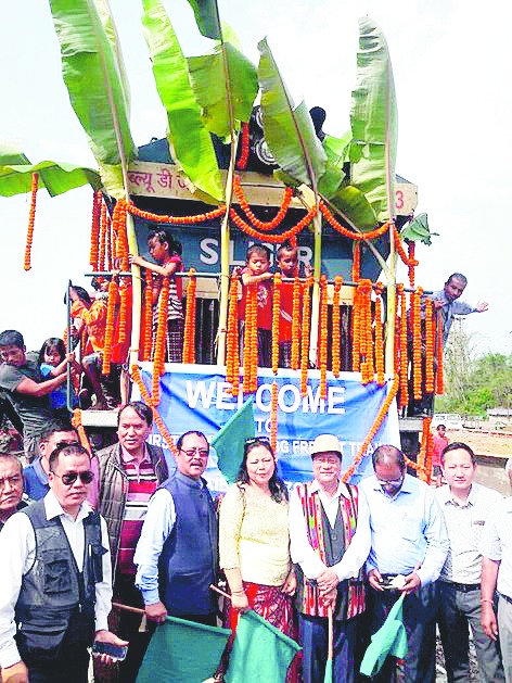 Silchar, March 21: The first broad-gauge commercial freight train chugged into Bairabi railway station in Mizoram today amid a rousing welcome.