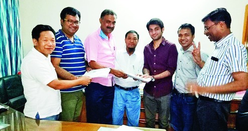 T.K. Engineering Consortium Pvt. Ltd and Sportzlive Entertainment Pvt. Ltd officials sign the franchisee agreement in Guwahati on Monday. Telegraph picture