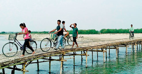 During winters, the villagers construct a temporary bamboo bridge, which makes it easier for them to cross the river, but during the monsoon the people suffer# with only the boat as an option to cross the unpredictable Aie. One has to pay Rs 10 (for a bicycle) and Rs 20 (for a bike) to cross the bridge in winter.