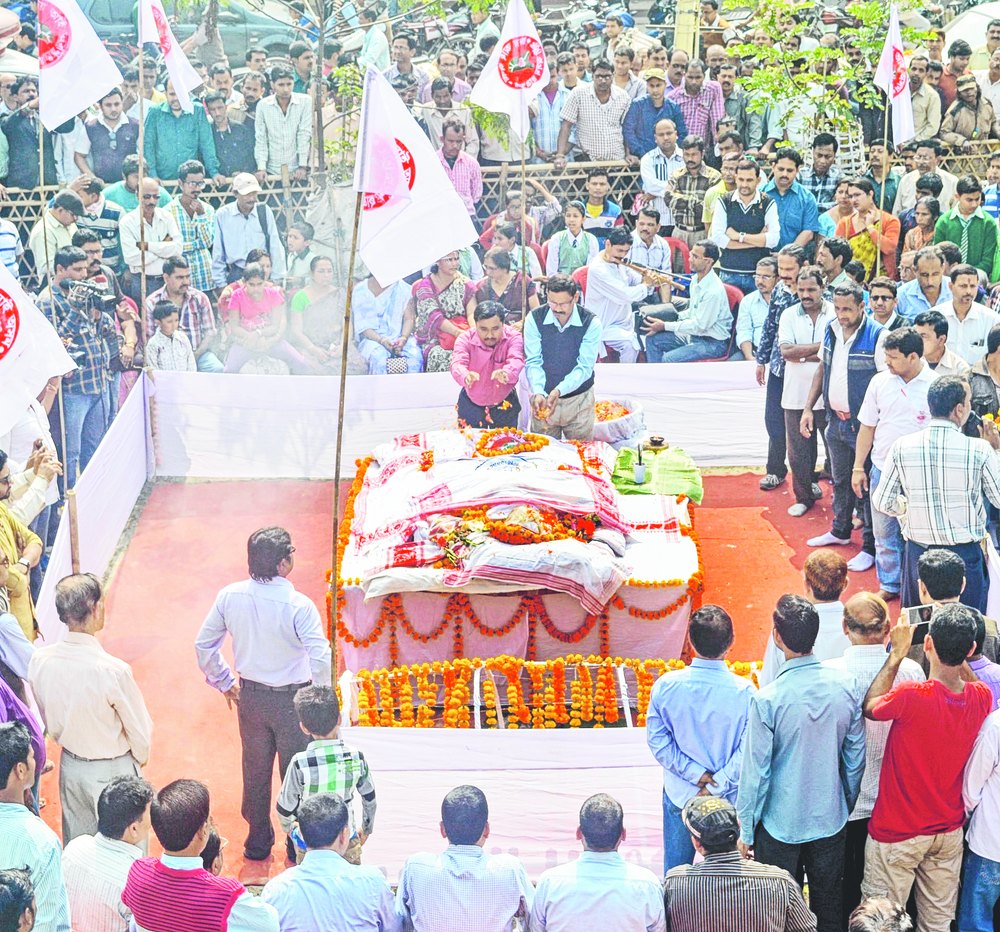 People and various organisations pay a tearful tribute to cultural icon Adya Sharma at his hometown Nalbari in lower Assam before the cremation on Monday afternoon.