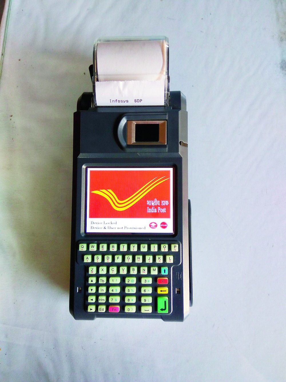 There is also the advantage of working offline and saving the data in a pen drive. The device is a slightly larger and heavier version of the equipment used to swipe debit cards in shops and uses a sim.