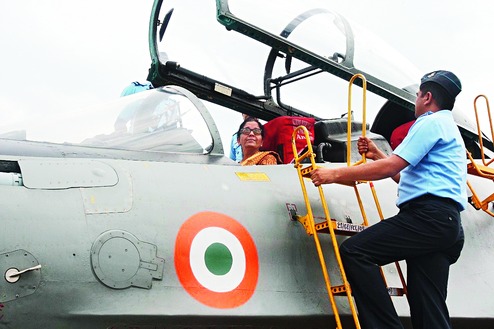 Defence minister Nirmala Sitharaman in the cockpit of a Sukhoi fighter jet at Tezpur Air Force Station on Sunday.