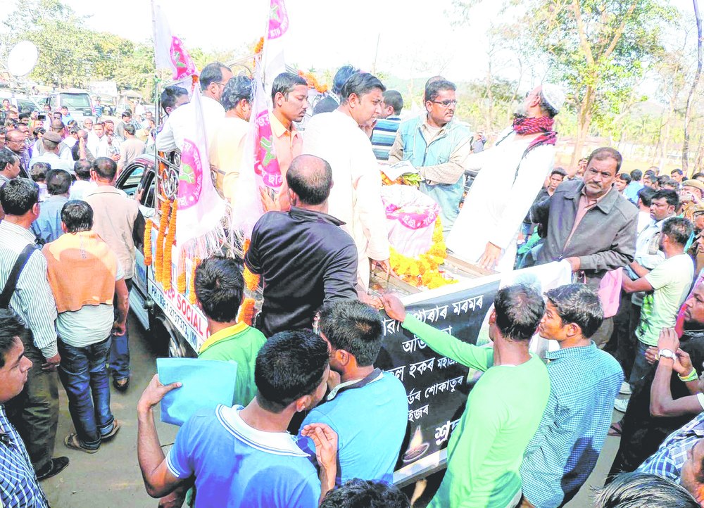 The actor's mortal remains were flown in from Mumbai to LGBI Airport in Borjhar this morning where All Assam Students' Union (AASU) members paid tribute. Later, members of the union accompanied the cortege to Goalpara, 130km from the airport.