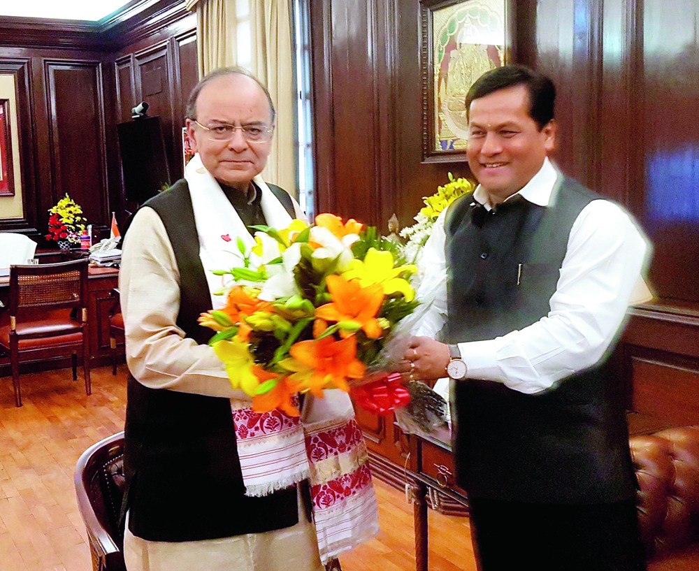 Assam chief minister Sarbananda Sonowal (right) with Union finance minister Arun Jaitley at the latter's office in New Delhi on Monday. Sonowal discussed issues such as early sanction of additional funds for the NRC update, implementation of the goods and services tax law, expeditious release of pending oil royalty and clearance of externally-aided projects by the finance ministry. Sonowal informed Jaitley that 92 per cent work on the NRC update has been completed. Text by a staff reporter and picture by UB Photos