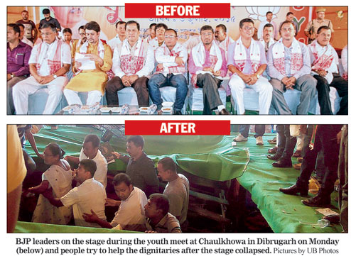 The stage they stood on to address the youths at the Yuva Sanmilan in Chaulkhowa in Dibrugarh district today suddenly caved in, bringing them down with it. They escaped with minor injuries.