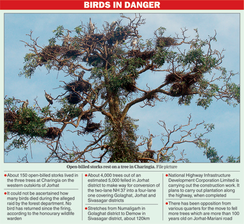 Jorhat, Nov. 19: A large number of open-billed storks died when forest department personnel allegedly opened fire at three trees where these birds were nesting to make way for the four-lane National Highway 37 here.