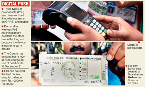 Guwahati, Nov. 23: The Centre's push for a cashless economy post-demonetisation has led to a substantial surge in demand for debit/credit card swipe machines from small businesses in the Northeast.