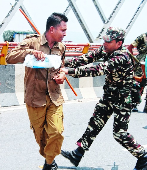 The protesters, shouting slogans against the government, breached the barricades put up by police and tried to climb on the railings of the bridge in a bid to dive into the river when police resorted to caning to disperse them.