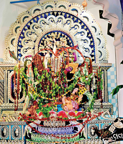 Unlike the chandi medhas of the other puja mandaps in the city, the silver tarkashi backdrop at Bakhrabad has a tree, along with motifs of skeleton, wolves and owls, that relates to death.