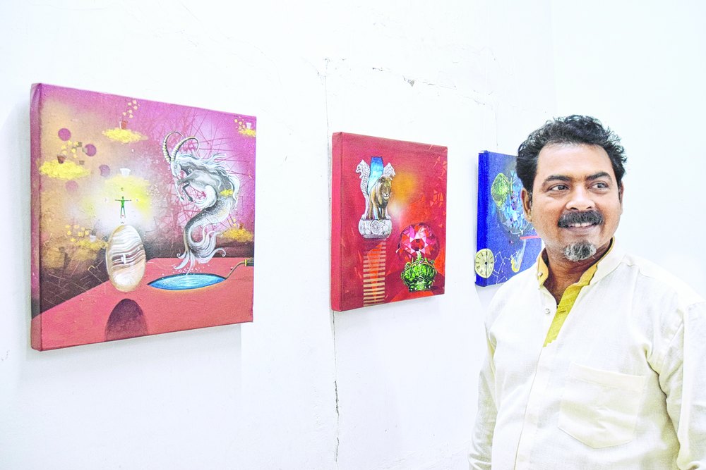 Pradosh, known for his broad range of colours and symbols, is displaying his best paintings at the art show. He uses political and social icons like the national emblem consisting of the four lions or even the symbol of Lady Justice representing law can be seen among other depictions. A clock that portrays the current time is also attracting many visitors. His art talks about the decline of law, justice and social order to mere symbols and formalities.