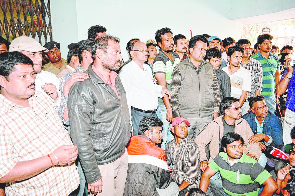 Adhunik Metallic workers gather at the deputy labour commissioner's office in Rourkela on Friday. Picture by Uttam Kumar Pal