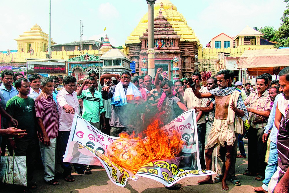 The Jagannath Sena, an organisation working for the protection of the Jagannath culture, demonstrated and smeared black ink on the effigies of civil aviation minister Ashok Gajapathi Raju and state tourism and culture minister Ashok Panda.