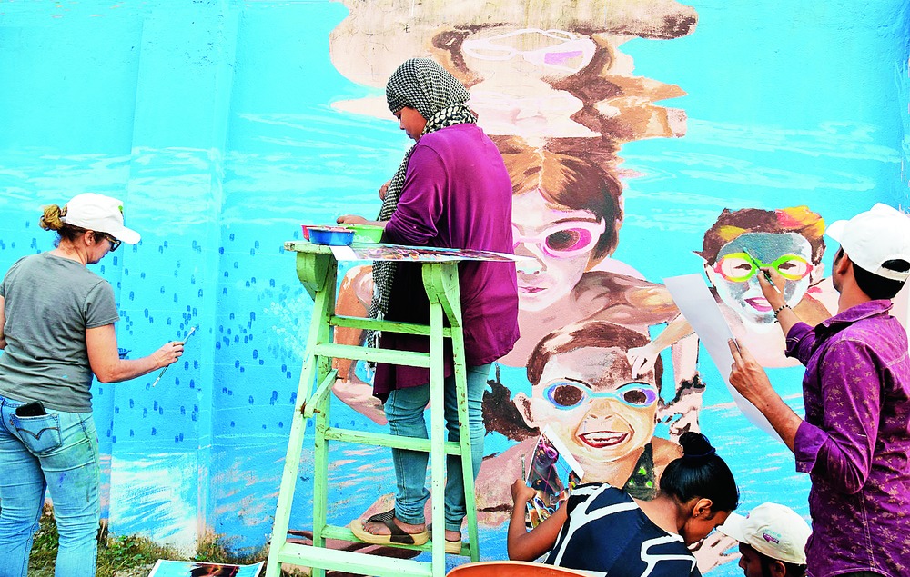 Tracy, globally known for her street paintings, created artworks, along with the young artists. Tracy painted 3-D illustrations on the walls and streets at Satya Nagar in front of the office of Bakul Foundation, which is hosting her for a two-day workshop. The artist gave valuable tips to participants in creating a 3-D effect. "This mural looks like children swimming in an aquarium behind the wall," said Tracy.