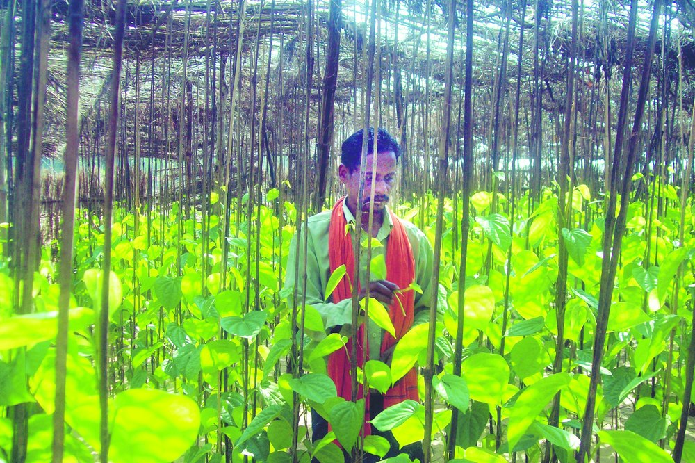 Prakash Muduli works at his betel vineyard in Patana village. Telegraph picture