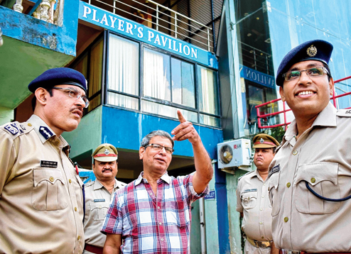 | Police commissioner RP Sharma and DCP, Cuttack, Sanjeev Arora and DCP, Bhubaneswar, Satyabrata Bhoi review security arrangements at Barabati stadium on Thursday. Picture by Badrika Nath Das |