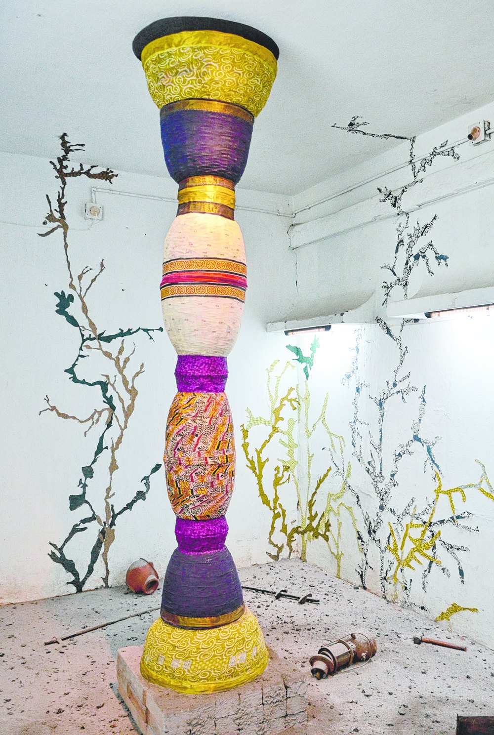 The artist's perception has been skilfully portrayed in his works. Colourful pillar-like structures represent the old deities in new avatar. To depict the spirit of Nabakalebar, Ojha has wrapped colourful clothes around the pillars. He has brought ashes from a village he had visited and layered it around the central structure. From the ashes, one can spot antique objects. On the walls, he has created termite lines with clothes. "The old is being eaten by termites. However, even in this phase of development, the city doesn't let go of its tradition," said Ojha.