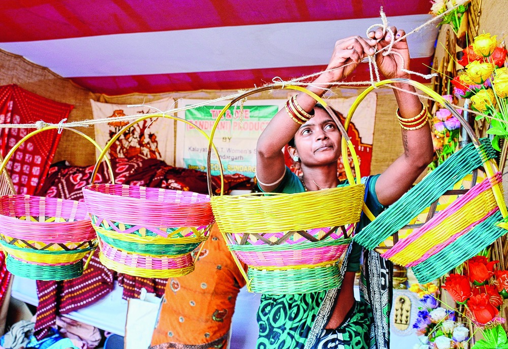 A woman displays her wares at a kiosk at Tribal Exhibition and Fair on Adivasi Ground in Bhubaneswar on Monday.