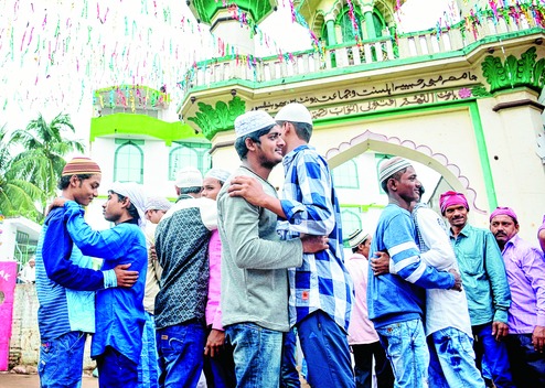 Youths embrace each other after prayers at a mosque at Unit-III in Bhubaneswar on Monday.