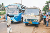 | Private city buses such as these ply in Berhampur at present. Picture by Gopal Krishna Reddy |