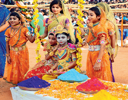 Children dressed as Radha and Krishna on the occasion of Dola Yatra at the Kalinga Institute of Social Science in Bhubaneswar on Wednesday. Picture by Sanjib Mukherjee