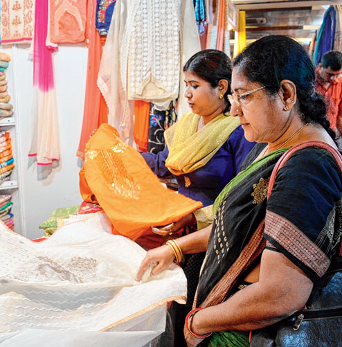 The exhibition has 65 kiosks laden with hand block printed saris, baluchuri saris, Karnataka silk saris, chanderi silk, Banarasi, jamdani and kota saris among others.
