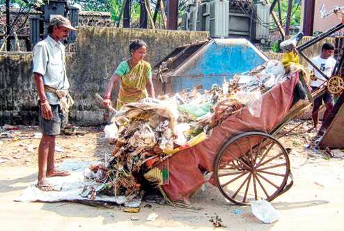 Sanitation workers cart municipal waste to roadside bins in Cuttack on Sunday. Picture by Badrika Nath Das