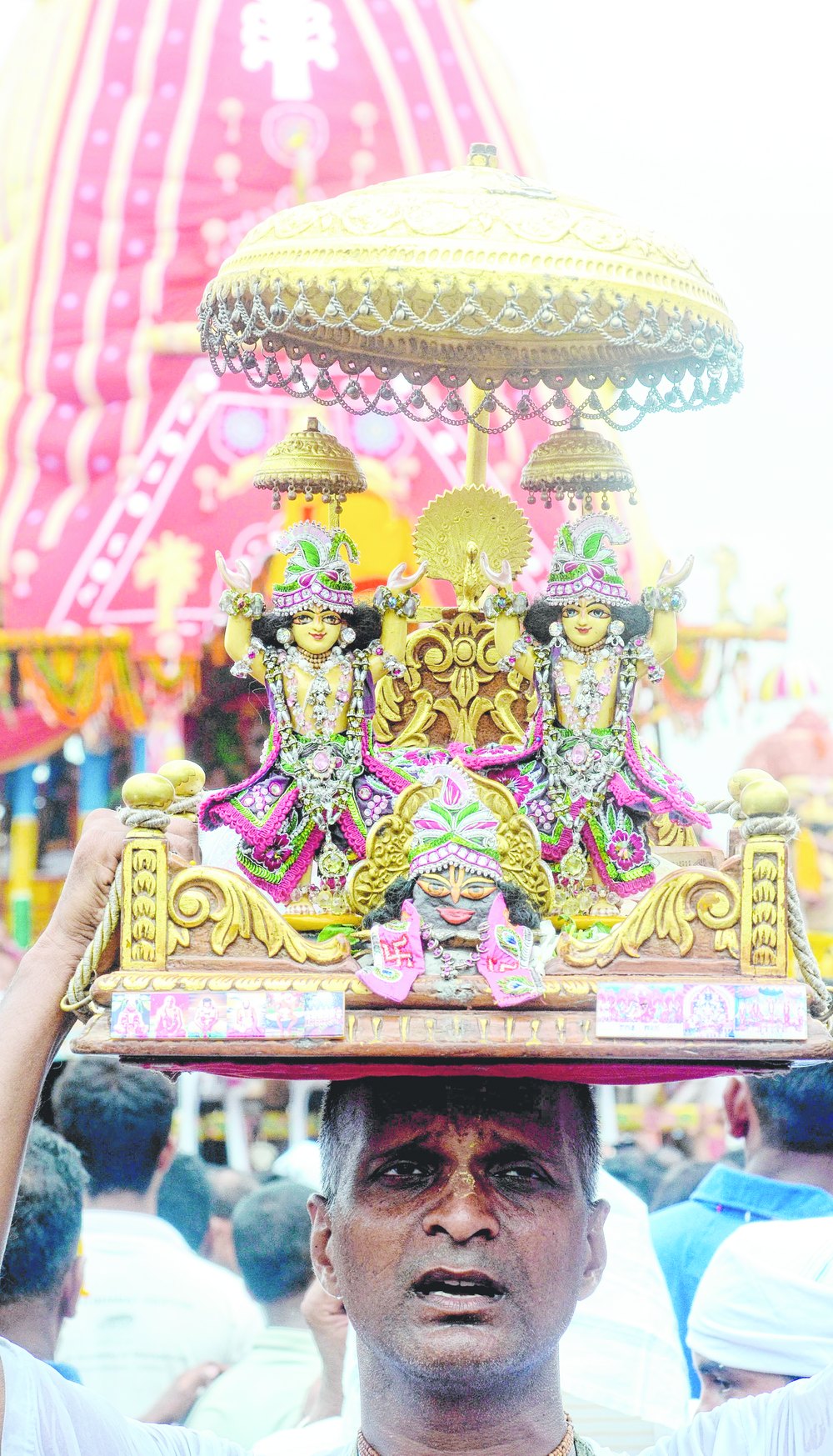 He placed me on his shoulder for me to have a better view of the deities. Jostling with the crowd, he said: "Look there. He is Jagannath Mahaprabhu with his brother and sister on the chariot. You can talk to Him about your concerns and He will listen to you."