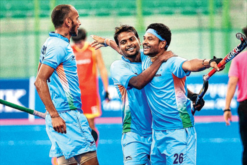 | Birendra Lakra (wearing a headband), member of the Indian gold-winning Asiad hockey team, celebrates a goal against China during a recent clash at the Incheon Asian Games in South Korea. (PTI) |