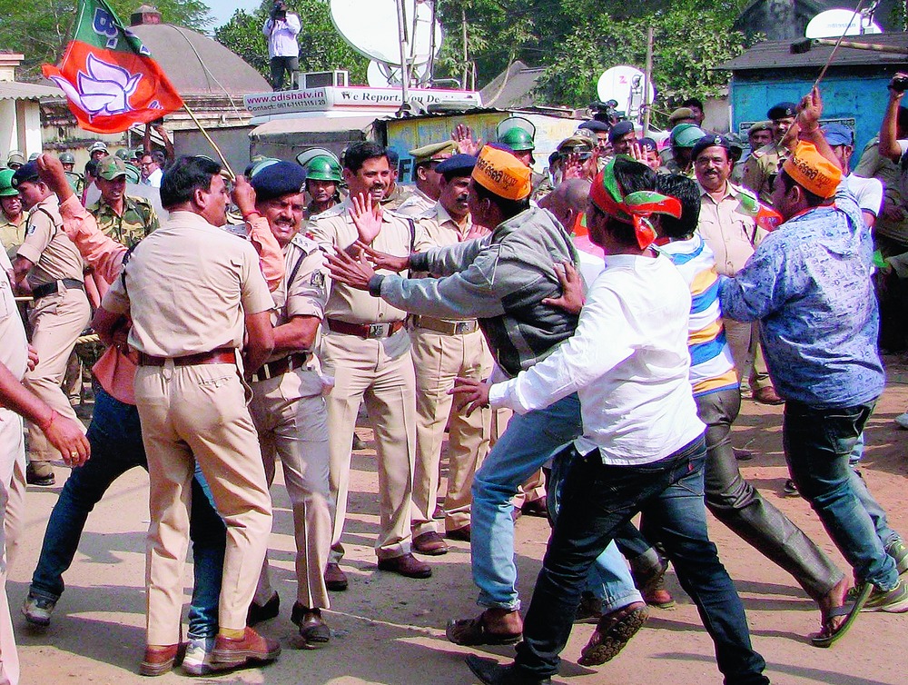 Hundreds of BJP members scuffled with the police in Cuttack as they tried to barge into the office of the director general of police despite prohibitory orders. The BJP activists alleged that police had adopted a partisan attitude during the dawn-to-dusk bandh called by them in Bhubaneswar yesterday. They accused the police of helping the BJD members who attacked them "even though they were demonstrating peacefully".