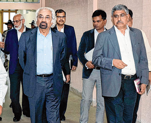 Sam Pitroda (left), along with development commissioner R Balakrishnan (right) in the state secretariat on Wednesday.