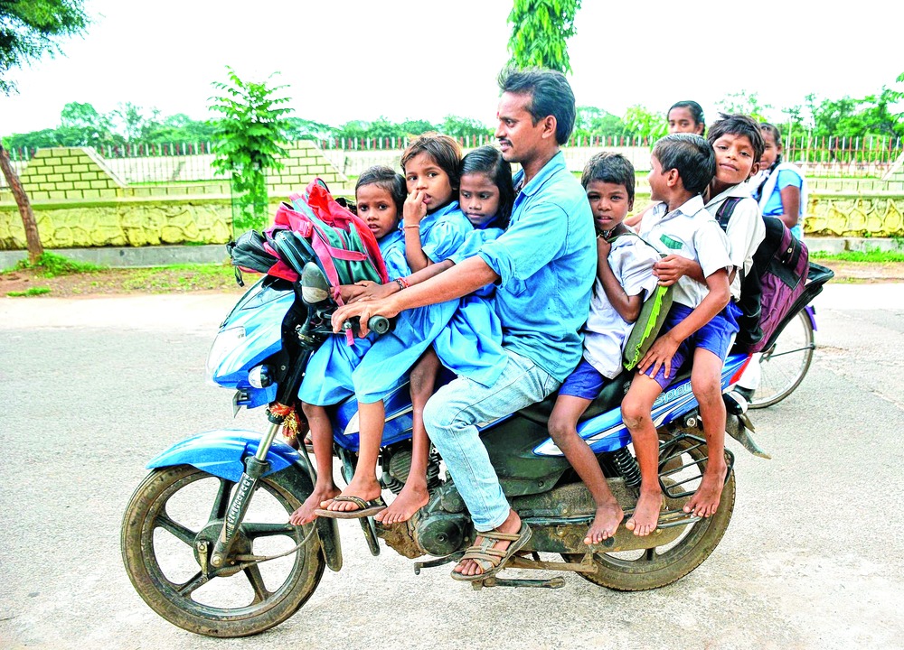 Children on their way to school on a motorcycle in Rourkela. Picture by Uttam Kumar Pal