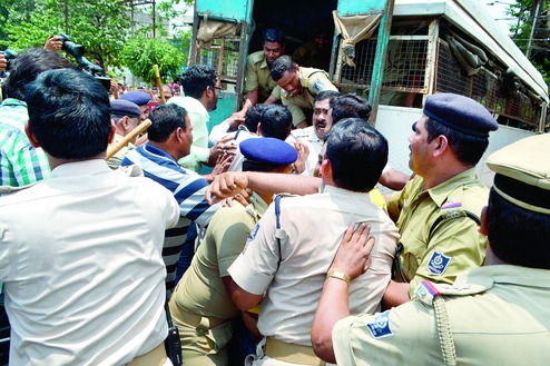 Irate workers burn police van in Orissa