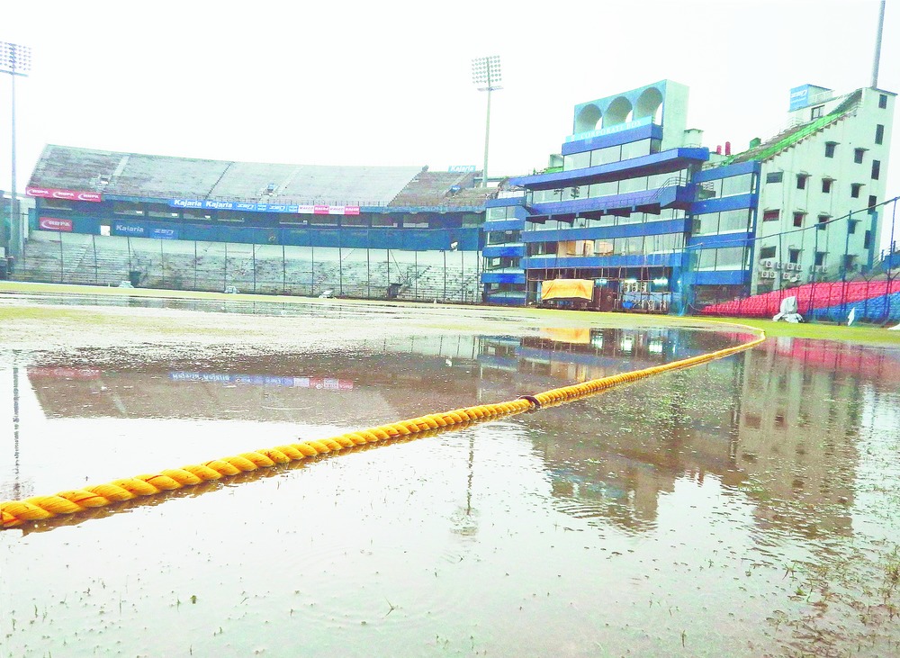 A 40-minute spell of rain during the late afternoon today in Cuttack left the ground waterlogged. The ground staff members of the Odisha Cricket Association are facing an uphill task in making the stadium ready for the match. It rained 12.8mm in Cuttack today. Association curator Pankaj Patnaik, however, claimed that today's rain would not create any problems for hosting the match as efforts were on to drain out the water from the ground.