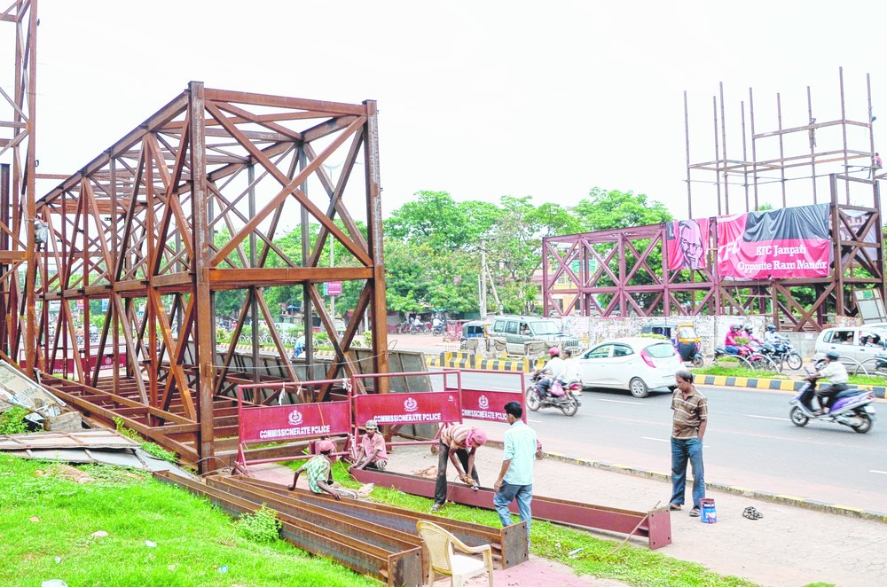 While the stairs leading to the bridge on both sides of the Jayadev Vihar-Nandankanan Road is complete, the construction company is waiting for the weather to improve to fix the overhead platform.