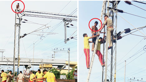 Berhampur: A scene from Bollywood blockbuster Sholay played out at the city railway station after a 29-year-old man from Assam climbed the portal mast and threatened to commit suicide if the authorities did not trace his missing friend on Wednesday.