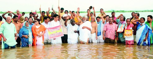 Members of Mahanadi Bachao Andolan stage a demonstration in the river in Cuttack on Friday. Picture by Badrika Nath Das