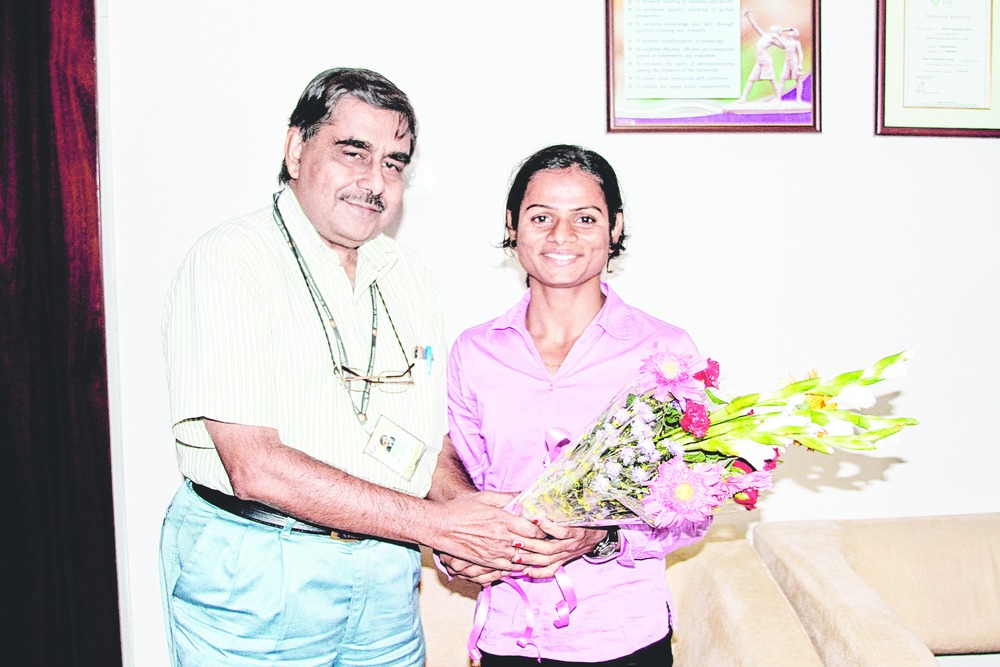 The varsity presented her a cheque of Rs 50,000 and a memento. The vice-chancellor of the varsity, Amit Banerjee, announced that they would develop a sports drink for the nourishment of athletes. The drink, to be named after Dutee, will be a combination of vitamins and nutrients extracted from natural sources. Researchers at the medical and pharmaceutical colleges of the varsity will work towards manufacturing the drink. Dutee spoke on various issues ranging from her experiences in life and the trends in athletics.