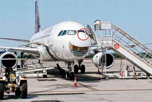 Passengers of a Bhubaneswar-bound Vistara flight from New Delhi (picture left) had a close shave after it was allegedly hit by a bird while landing at the Biju Patnaik International Airport on Thursday morning. The flight, which had taken off from New Delhi with 51 passengers and six crewmembers, landed here around 8.35am. Though the incident left the aircraft's nose cone (circled in red) badly damaged, no one was injured.