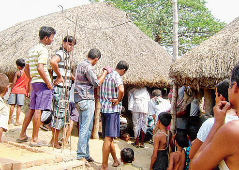 | Villagers outside the victim’s house at Basudevpur in Bhadrak district on Thursday. Telegraph picture |