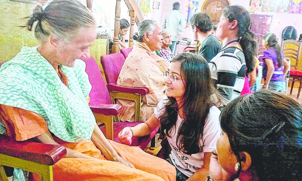 Youths interact with elderly women at an old-age home in Bhubaneswar. Telegraph picture