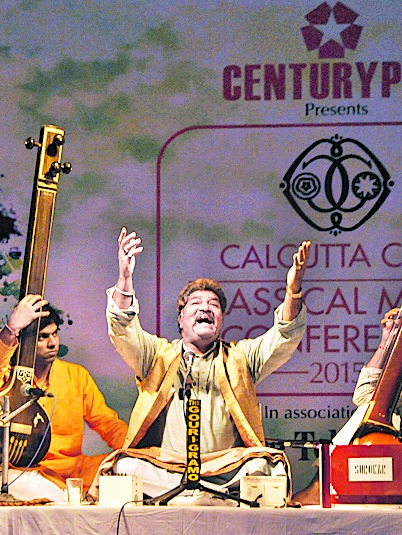 He was excused for all his galtis (mistakes), and he ought to be. Shaukat Hussain Khan (picture, left), the able son of Ustad Sharafat Hussain Khan, showed how an ancient and prestigious gharana returns to life. The two-day music festival arranged by Calcutta Club in association with The Telegraph was enlivened by the magical performance of Khan, who can perfectly merge the domineering traits of a mardana (masculine) gharana (Agra-Atrauli) with the pain of human sentiments in his singing style. He commenced with Raga Jaijaiwanti and enthralled the audience with the traditional and elaborate alaap (called nom-tom alaap, an excerpt from Dhrupad, with the abbreviation of phrases like "Hari Om Ananta Narayanam"), which is rarely heard in a vocal recital.