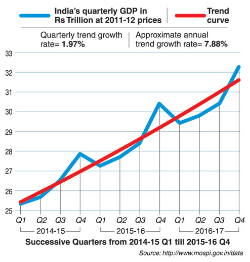 The diagram captures the calculation. The blue wiggling curve represents the quarterly GDPs for each quarter (in trillions of Indian rupees), starting from the first quarter of FY 14-15 till the end of the last quarter of FY 16-17. Suppose, however, that the GDPs were rising at a constant compound rate. Is there a constant rate that closely reflects the non-constant wobbly behaviour? The answer to the question is an unqualified "yes" and economists call it the trend rate of growth. The thick red curve in the diagram shows the path followed by the quarterly GDPs rising at the trend rate of growth. The quarterly trend growth rate turns out to be 1.97 per cent, so that the underlying annual rate of growth is (1.974=) 7.88 per cent approximately. Subtracting the estimated population growth rate of 1.2 per cent for this period, the average annual growth rate of per capita GDP for the period turns out to be 6.68 per cent.