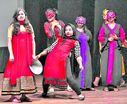 The young actors, who themselves voted for this text, were bubbling with enthusiasm. Rai Debnath as Lysistrata, Sananda Gopalakrishnan as Lampito, Sayon Banerjee as Cinesias, Adrija Ghosh as Myrrhine and nearly every member of the old men and old women choruses added their bit to the enjoyment.