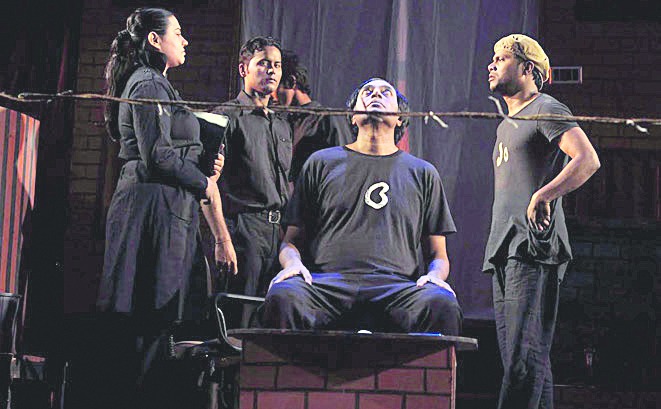 Among new work, two dramatizer-directors offered courageous adaptations of seminal novels, from English and Bengali respectively. To choose Ken Kesey's frightening One Flew over the Cuckoo's Nest itself proves that Koushik Kar loves a challenge, but he also naturalizes it creatively in Kolkata Rangeela's Natak Phatak, turning the latest entrant in a mental hospital (whom Jack Nicholson immortalized in the film) into a theatre artist. This posits theatre as a profession that only the insane can think of taking up - it brings no financial stability - as well as its potential as the most subversive of arts in a regimented society, which therefore deems its activists dangerous enough to merit the loony bin and, eventually, lobotomization. Kar stays close to his source, yet suggests links with our own classics like Rakta-karabi: repeating Sumon Mukhopadhyay's design for that play of a wire fence separating inmates from spectators (picture), referring to men as numbers, the rebellion at the end. While his cast acts well, in the lead he indulges in his penchant for loud melodrama and playing to the gallery for instant applause too often. Ankita Majhi is wasted as the matron, because Kar imposes a permanent scowl on her face; does such an expression automatically indicate an evil person?