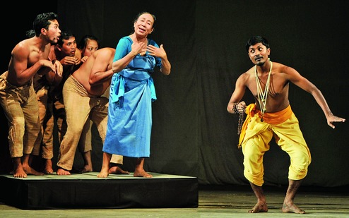 Sharma's "nugatory" nugget of a note invokes "pataphysics", the non-science coined by Alfred Jarry, whose brilliant parody Ubu Roi Calcutta has probably never seen staged. As a fake doctor, I recommend Sharma directs it next. Jarry's zany madness informs this play, chiefly targeting politicians (especially their statues on which birds love to drop) and other establishment figures, including both teachers and gangsters (Sharma in a welcomeback appearance). Ashok Singh gives a chiselled performance as poor Nachiketa (centre, picture). Bhattacharjee and Fatehpuria quick-change through multiple bizarre costumes compensating for their wan wardrobe in Yahan.