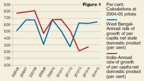 The graph provides food for thought. The annual rate of growth of per capita NSDP in West Bengal had dropped down to as low a value as 3.05 per cent in 2008-09, probably on account of the sub-prime crisis in the United States of America. One could explain this drop by the exit of the Tatas as well, but the explanation may be questioned, since the behaviour of the superimposed all-India picture is no different. In fact, the annual rate climbed up to 5.08 per cent during the last year of Left Front rule, raising serious doubts about the damage done to the West Bengal economy by the departure of the Tatas. Of course, there was a sharp drop to 2.71 per cent in the first year of the new government, but the all-India rate of growth collapsed to 2.12 per cent next year when West Bengal climbed up to a growth rate of 6.26 per cent and subsequently to 6.42 per cent in 2014-15. A puzzle could well be lurking here, for the present government's "poor image" theory runs contrary to the phenomenon of its per capita NSDP growth rate overtaking the all-India rate for most of its tenure. As far as this fact is concerned, West Bengal's recent performance has remained well within the comfort zone.