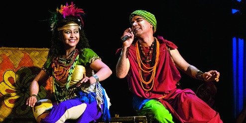 Halder has also directed, choreographed and composed the live music, a versatile accomplishment. But unlike his early success Meghnadbadh Kabya, this is not a one-man show. On the contrary, he commendably detaches himself from the stage as the narrator, cultivating an objective distance and tone, often pacing the aisles while his large team theatricalizes the action. Dyuti Ghosh Halder stands out as a spirited Mahuya (picture), but all contribute to a colourful - even unrealistically exotic - and power-packed presentation with hardly a moment's stillness.