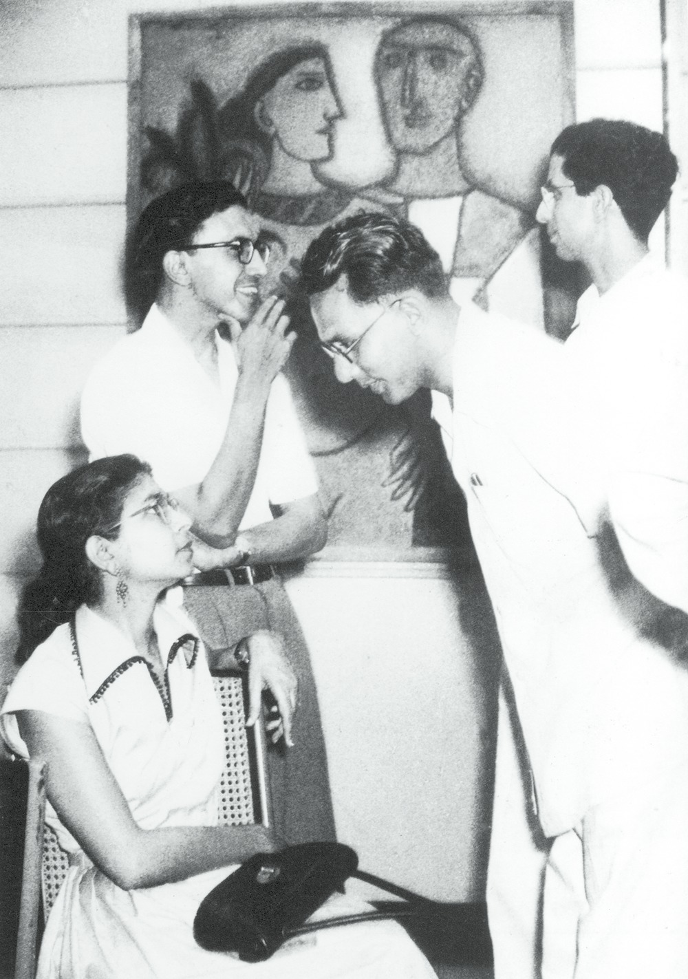 Now 90, Alkazi was born in Pune in 1925 to a Kuwaiti mother and a Saudi father, a wealthy trader of silks, spices, and condiments who'd sent Alkazi to London with Rs 25,000. After completing a degree at the Royal Academy of Dramatic Art, he returned to India in 1951 to begin his career in Bombay, even while the rest of his family left for Pakistan. He quickly joined a society of young artists and writers who sought to make India a base of post-war cosmopolitanism. The picture below exemplifies both the bespectacled hobnobbing and cultural agitating that was involved. Alkazi's wife Roshen, Alkazi, Ezekiel, and the artist H.A. Gade are chatting at a 1954 exhibition of paintings by their contemporary Akbar Padamsee. Lovers, the painting in the background, was forcibly removed from the show on obscenity charges, which Padamsee eventually beat in court.