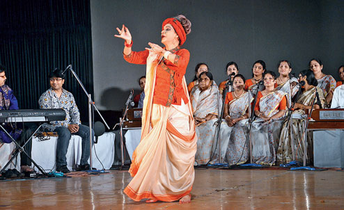 It was followed by a programme on Tagore’s bhanga gaan. Rabindrasangeet, especially those derived from Hindustani classical music, Indian or Western folksongs and tunes, are broadly categorized as bhanga gaan. The programme commenced with the song, “Amar sonar Bangla”, from an old recording of Suchitra Mitra. Senior artist Alokananda Roy presented a pleasing choreography with this song. Agnibha Bandyopadhyay sang “Kothay pabo tare”, “Khanchar bhitor” and “Se je moner manush”. “Madhur rupe birajo” was presented with the original Dhrupad-style song, “Kaun rup bane ho”, by Shamita Mukherjee and Shubhra Saha.